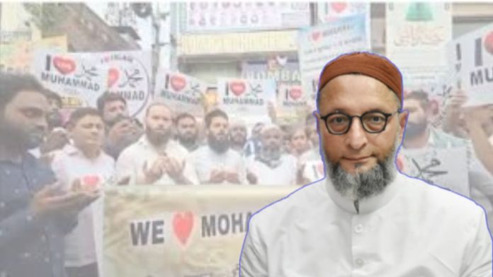 Hyderabad: AIMIM president and Hyderabad MP Asaduddin Owaisi sharply criticized the authorities for their handling of the “I Love Muhammad” campaign during a public meeting. He argued that while political slogans such as “I love Modi” are widely accepted, proclaiming “I love Muhammad” invites FIRs, detentions, and police crackdowns.